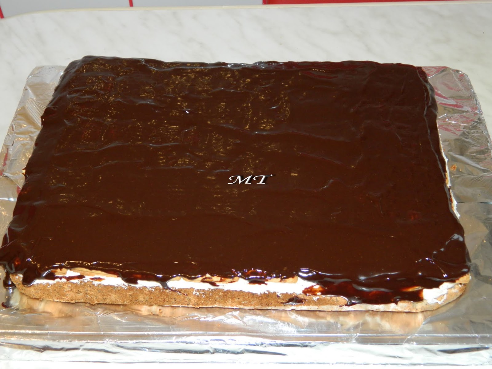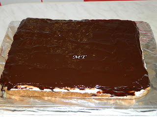 Glazură: 125 ml frişcă lichidă, 100 g ciocolată amăruie, 100 g cicolată cu lapte. Se omogenizează pe aburi şi se întinde peste prajitură.