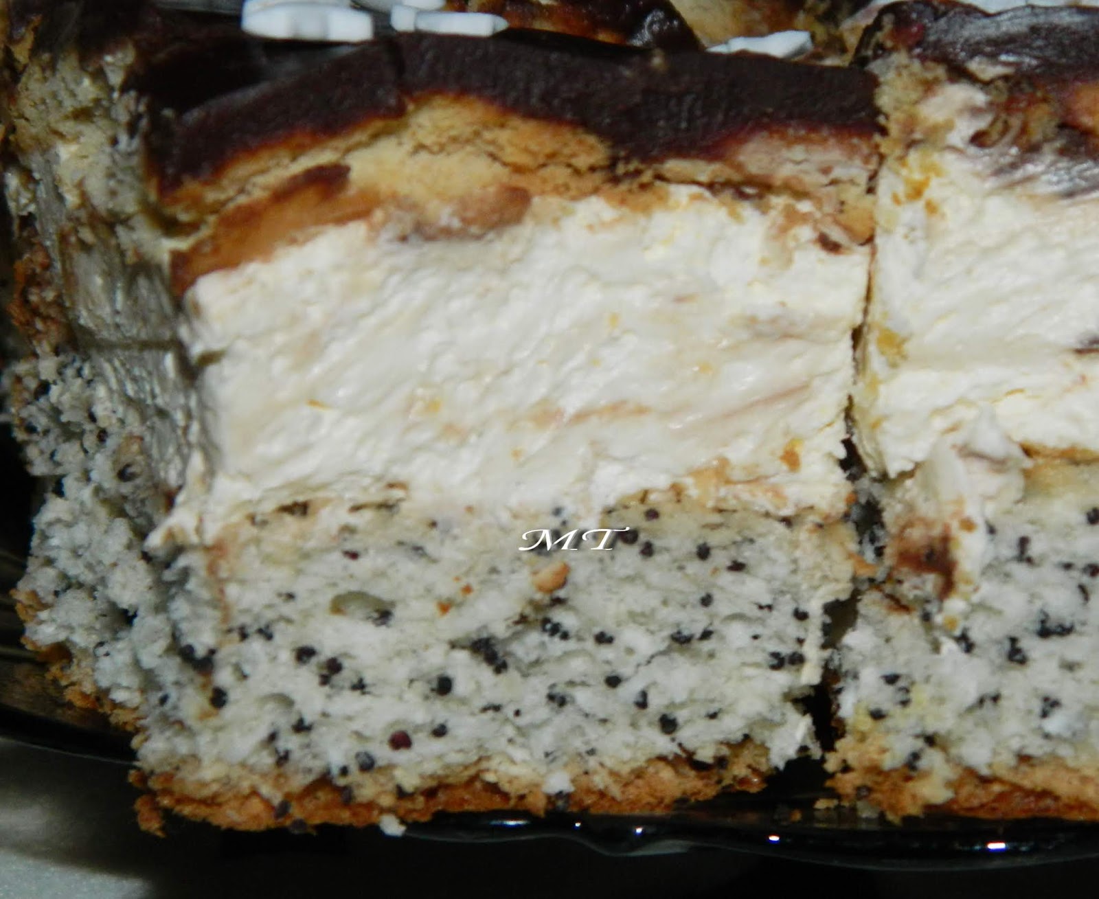Blat: 8 albuşuri, 200 g zahăr, 50 g mac, 100 g nucă de cocos, 4 linguri făină, 1 linguriţă de praf de copt.