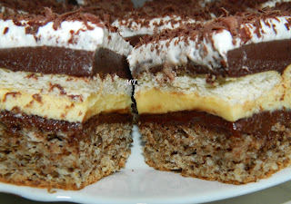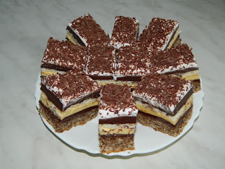 Blat: 8 albuşuri, 10 lg de zahăr, 140g nucă, 3 linguri făină, 3 linguri pesmet, 1 linguriţă praf de copt, 2 linguri ulei, 1 vârf de cuţit sare. (Puteam face şi blat din 7 ouă să fie mai subţire sau o tavă mai mare.)